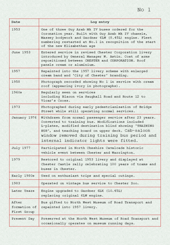 Chassis: Guy Arab Mk IVChassis Number:Engine: Gardner 6LW (later fitted with a Gardner 6LX ex No 45)Body: MasseyDelivered: June 1953